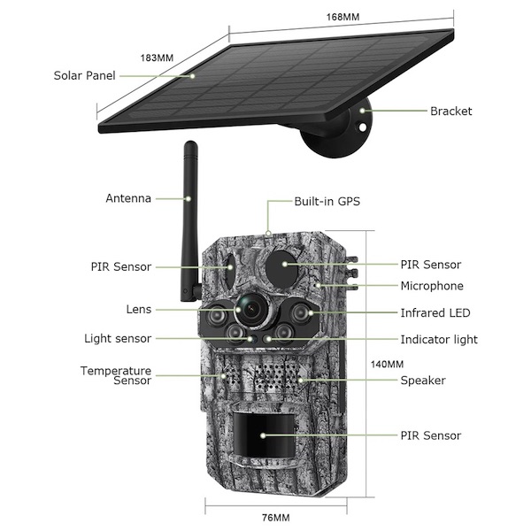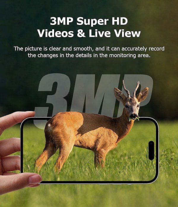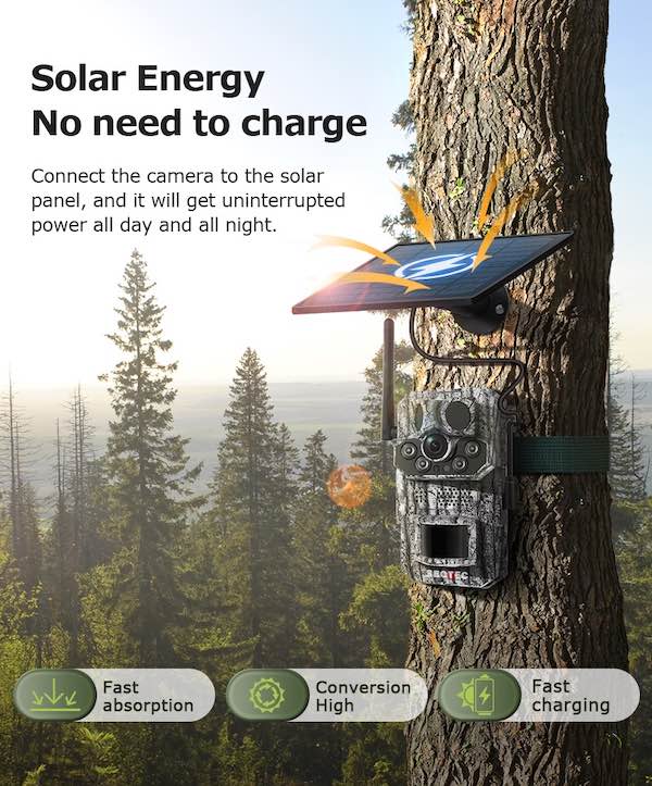 Continuous Solar Power: Equipped with a 5W external solar panel and a high-capacity 7800mAh rechargeable battery, this camera is designed for long-term, autonomous operation even in overcast conditions.