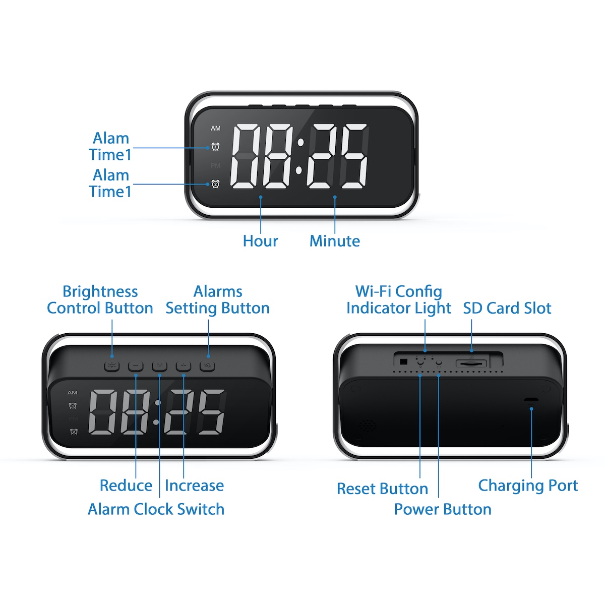 Functional & Discreet: Featuring a fully functional dual alarm and a dimmable LED display (5 brightness levels), the camera lens and controls are expertly integrated to maintain a clean, professional aesthetic.